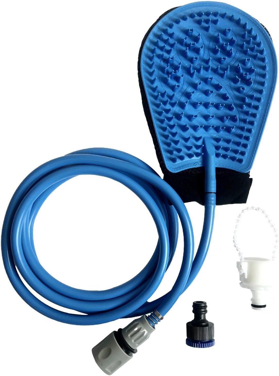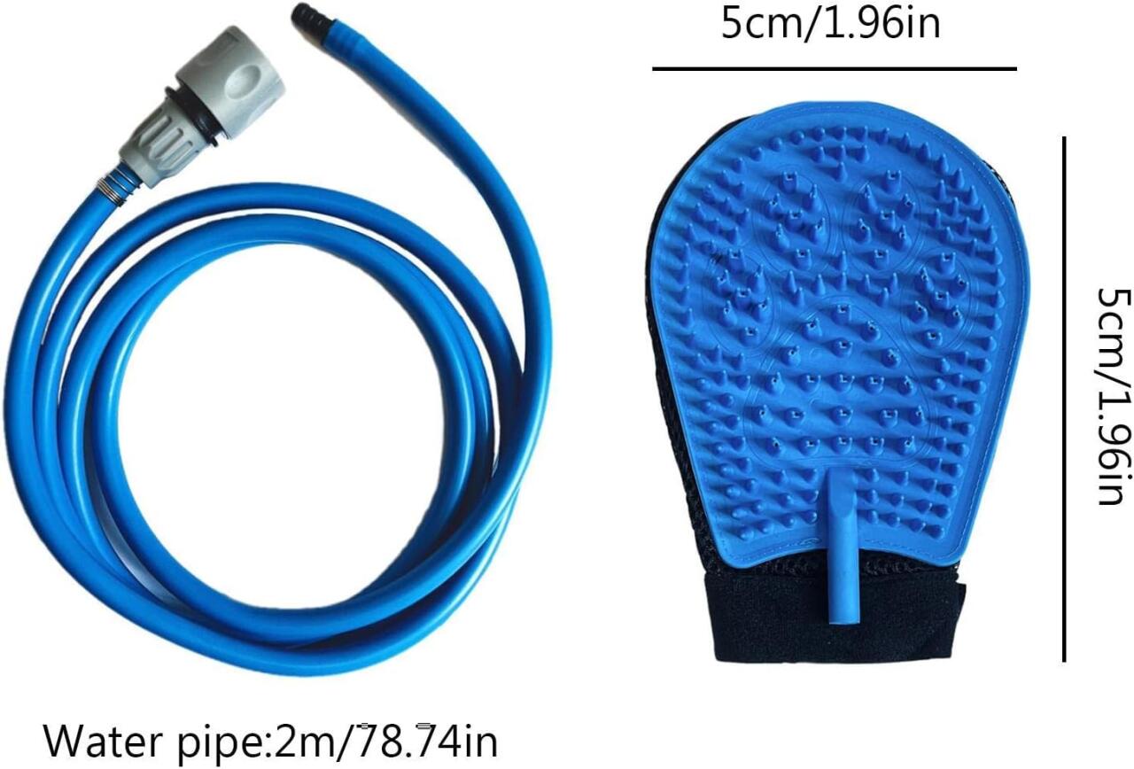 Guante para limpiar mascotas, específicamente diseñado para el baño y el cepillado de mascota. El guante está hecho de silicona flexible y resistente, con cerdas de goma en la superficie que ayudan a masajear y limpiar a fondo el pelaje de la mascota. El guante está diseñado para ser cómodo de usar, adaptándose a la forma de la mano y asegurando un buen agarre durante el uso. Este guante puede ser utilizado tanto en seco como en mojado, lo que lo hace ideal para el baño y el cepillado diario de la mascota. Viene con una manguera y conectores que permiten acoplar el guante a una fuente de agua, facilitando el proceso de lavado.